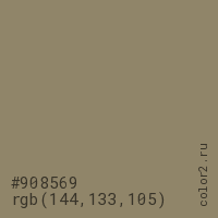 Цвет #908569 в цветовой модели RGB обозначается тремя октетами (144, 133, 105) в десятичном формате и #908569 в шестнадцатиричном (hex) формате, которые являются интенсивностью красного 144 (hex 90), интенсивность зелёного 133 (hex 85) и интенсивность синего 105 (hex 69).