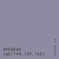 Цвет #908BA0 в цветовой модели RGB обозначается тремя октетами (144, 139, 160) в десятичном формате и #908BA0 в шестнадцатиричном (hex) формате, которые являются интенсивностью красного 144 (hex 90), интенсивность зелёного 139 (hex 8B) и интенсивность синего 160 (hex A0).
