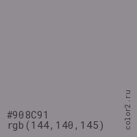 Цвет #908C91 в цветовой модели RGB обозначается тремя октетами (144, 140, 145) в десятичном формате и #908C91 в шестнадцатиричном (hex) формате, которые являются интенсивностью красного 144 (hex 90), интенсивность зелёного 140 (hex 8C) и интенсивность синего 145 (hex 91).