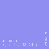 Цвет #908FF1 в цветовой модели RGB обозначается тремя октетами (144, 143, 241) в десятичном формате и #908FF1 в шестнадцатиричном (hex) формате, которые являются интенсивностью красного 144 (hex 90), интенсивность зелёного 143 (hex 8F) и интенсивность синего 241 (hex F1).