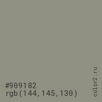 Цвет #909182 в цветовой модели RGB обозначается тремя октетами (144, 145, 130) в десятичном формате и #909182 в шестнадцатиричном (hex) формате, которые являются интенсивностью красного 144 (hex 90), интенсивность зелёного 145 (hex 91) и интенсивность синего 130 (hex 82).