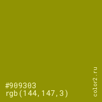 Цвет #909303 в цветовой модели RGB обозначается тремя октетами (144, 147, 3) в десятичном формате и #909303 в шестнадцатиричном (hex) формате, которые являются интенсивностью красного 144 (hex 90), интенсивность зелёного 147 (hex 93) и интенсивность синего 3 (hex 03).