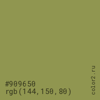 Цвет #909650 в цветовой модели RGB обозначается тремя октетами (144, 150, 80) в десятичном формате и #909650 в шестнадцатиричном (hex) формате, которые являются интенсивностью красного 144 (hex 90), интенсивность зелёного 150 (hex 96) и интенсивность синего 80 (hex 50).