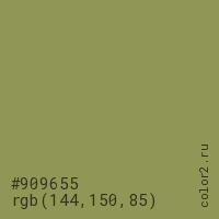 Цвет #909655 в цветовой модели RGB обозначается тремя октетами (144, 150, 85) в десятичном формате и #909655 в шестнадцатиричном (hex) формате, которые являются интенсивностью красного 144 (hex 90), интенсивность зелёного 150 (hex 96) и интенсивность синего 85 (hex 55).