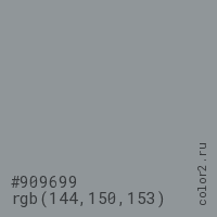 Цвет #909699 в цветовой модели RGB обозначается тремя октетами (144, 150, 153) в десятичном формате и #909699 в шестнадцатиричном (hex) формате, которые являются интенсивностью красного 144 (hex 90), интенсивность зелёного 150 (hex 96) и интенсивность синего 153 (hex 99).