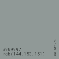 Цвет #909997 в цветовой модели RGB обозначается тремя октетами (144, 153, 151) в десятичном формате и #909997 в шестнадцатиричном (hex) формате, которые являются интенсивностью красного 144 (hex 90), интенсивность зелёного 153 (hex 99) и интенсивность синего 151 (hex 97).