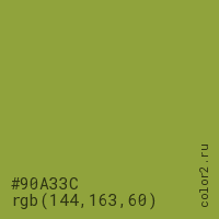 Цвет #90A33C в цветовой модели RGB обозначается тремя октетами (144, 163, 60) в десятичном формате и #90A33C в шестнадцатиричном (hex) формате, которые являются интенсивностью красного 144 (hex 90), интенсивность зелёного 163 (hex A3) и интенсивность синего 60 (hex 3C).
