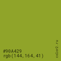 Цвет #90A429 в цветовой модели RGB обозначается тремя октетами (144, 164, 41) в десятичном формате и #90A429 в шестнадцатиричном (hex) формате, которые являются интенсивностью красного 144 (hex 90), интенсивность зелёного 164 (hex A4) и интенсивность синего 41 (hex 29).