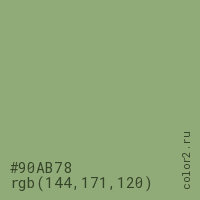 Цвет #90AB78 в цветовой модели RGB обозначается тремя октетами (144, 171, 120) в десятичном формате и #90AB78 в шестнадцатиричном (hex) формате, которые являются интенсивностью красного 144 (hex 90), интенсивность зелёного 171 (hex AB) и интенсивность синего 120 (hex 78).