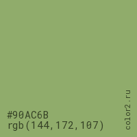 Цвет #90AC6B в цветовой модели RGB обозначается тремя октетами (144, 172, 107) в десятичном формате и #90AC6B в шестнадцатиричном (hex) формате, которые являются интенсивностью красного 144 (hex 90), интенсивность зелёного 172 (hex AC) и интенсивность синего 107 (hex 6B).