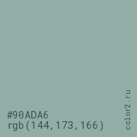 Цвет #90ADA6 в цветовой модели RGB обозначается тремя октетами (144, 173, 166) в десятичном формате и #90ADA6 в шестнадцатиричном (hex) формате, которые являются интенсивностью красного 144 (hex 90), интенсивность зелёного 173 (hex AD) и интенсивность синего 166 (hex A6).