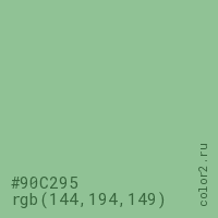 Цвет #90C295 в цветовой модели RGB обозначается тремя октетами (144, 194, 149) в десятичном формате и #90C295 в шестнадцатиричном (hex) формате, которые являются интенсивностью красного 144 (hex 90), интенсивность зелёного 194 (hex C2) и интенсивность синего 149 (hex 95).