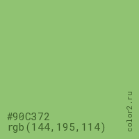 Цвет #90C372 в цветовой модели RGB обозначается тремя октетами (144, 195, 114) в десятичном формате и #90C372 в шестнадцатиричном (hex) формате, которые являются интенсивностью красного 144 (hex 90), интенсивность зелёного 195 (hex C3) и интенсивность синего 114 (hex 72).