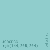 Цвет #90CDCC в цветовой модели RGB обозначается тремя октетами (144, 205, 204) в десятичном формате и #90CDCC в шестнадцатиричном (hex) формате, которые являются интенсивностью красного 144 (hex 90), интенсивность зелёного 205 (hex CD) и интенсивность синего 204 (hex CC).
