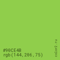 Цвет #90CE4B в цветовой модели RGB обозначается тремя октетами (144, 206, 75) в десятичном формате и #90CE4B в шестнадцатиричном (hex) формате, которые являются интенсивностью красного 144 (hex 90), интенсивность зелёного 206 (hex CE) и интенсивность синего 75 (hex 4B).