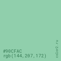 Цвет #90CFAC в цветовой модели RGB обозначается тремя октетами (144, 207, 172) в десятичном формате и #90CFAC в шестнадцатиричном (hex) формате, которые являются интенсивностью красного 144 (hex 90), интенсивность зелёного 207 (hex CF) и интенсивность синего 172 (hex AC).