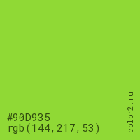 Цвет #90D935 в цветовой модели RGB обозначается тремя октетами (144, 217, 53) в десятичном формате и #90D935 в шестнадцатиричном (hex) формате, которые являются интенсивностью красного 144 (hex 90), интенсивность зелёного 217 (hex D9) и интенсивность синего 53 (hex 35).