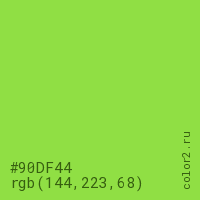 Цвет #90DF44 в цветовой модели RGB обозначается тремя октетами (144, 223, 68) в десятичном формате и #90DF44 в шестнадцатиричном (hex) формате, которые являются интенсивностью красного 144 (hex 90), интенсивность зелёного 223 (hex DF) и интенсивность синего 68 (hex 44).
