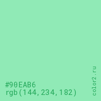 Цвет #90EAB6 в цветовой модели RGB обозначается тремя октетами (144, 234, 182) в десятичном формате и #90EAB6 в шестнадцатиричном (hex) формате, которые являются интенсивностью красного 144 (hex 90), интенсивность зелёного 234 (hex EA) и интенсивность синего 182 (hex B6).