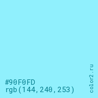 Цвет #90F0FD в цветовой модели RGB обозначается тремя октетами (144, 240, 253) в десятичном формате и #90F0FD в шестнадцатиричном (hex) формате, которые являются интенсивностью красного 144 (hex 90), интенсивность зелёного 240 (hex F0) и интенсивность синего 253 (hex FD).