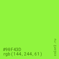 Цвет #90F43D в цветовой модели RGB обозначается тремя октетами (144, 244, 61) в десятичном формате и #90F43D в шестнадцатиричном (hex) формате, которые являются интенсивностью красного 144 (hex 90), интенсивность зелёного 244 (hex F4) и интенсивность синего 61 (hex 3D).