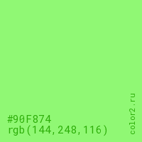 Цвет #90F874 в цветовой модели RGB обозначается тремя октетами (144, 248, 116) в десятичном формате и #90F874 в шестнадцатиричном (hex) формате, которые являются интенсивностью красного 144 (hex 90), интенсивность зелёного 248 (hex F8) и интенсивность синего 116 (hex 74).