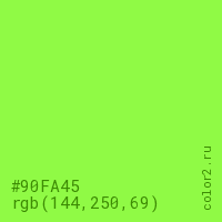Цвет #90FA45 в цветовой модели RGB обозначается тремя октетами (144, 250, 69) в десятичном формате и #90FA45 в шестнадцатиричном (hex) формате, которые являются интенсивностью красного 144 (hex 90), интенсивность зелёного 250 (hex FA) и интенсивность синего 69 (hex 45).
