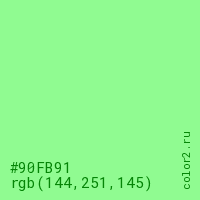 Цвет #90FB91 в цветовой модели RGB обозначается тремя октетами (144, 251, 145) в десятичном формате и #90FB91 в шестнадцатиричном (hex) формате, которые являются интенсивностью красного 144 (hex 90), интенсивность зелёного 251 (hex FB) и интенсивность синего 145 (hex 91).