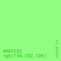 Цвет #90FC82 в цветовой модели RGB обозначается тремя октетами (144, 252, 130) в десятичном формате и #90FC82 в шестнадцатиричном (hex) формате, которые являются интенсивностью красного 144 (hex 90), интенсивность зелёного 252 (hex FC) и интенсивность синего 130 (hex 82).