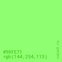 Цвет #90FE71 в цветовой модели RGB обозначается тремя октетами (144, 254, 113) в десятичном формате и #90FE71 в шестнадцатиричном (hex) формате, которые являются интенсивностью красного 144 (hex 90), интенсивность зелёного 254 (hex FE) и интенсивность синего 113 (hex 71).