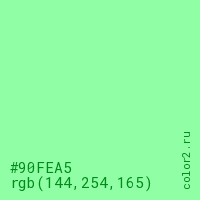 Цвет #90FEA5 в цветовой модели RGB обозначается тремя октетами (144, 254, 165) в десятичном формате и #90FEA5 в шестнадцатиричном (hex) формате, которые являются интенсивностью красного 144 (hex 90), интенсивность зелёного 254 (hex FE) и интенсивность синего 165 (hex A5).