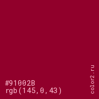 Цвет #91002B в цветовой модели RGB обозначается тремя октетами (145, 0, 43) в десятичном формате и #91002B в шестнадцатиричном (hex) формате, которые являются интенсивностью красного 145 (hex 91), интенсивность зелёного 0 (hex 00) и интенсивность синего 43 (hex 2B).