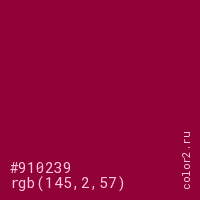 Цвет #910239 в цветовой модели RGB обозначается тремя октетами (145, 2, 57) в десятичном формате и #910239 в шестнадцатиричном (hex) формате, которые являются интенсивностью красного 145 (hex 91), интенсивность зелёного 2 (hex 02) и интенсивность синего 57 (hex 39).