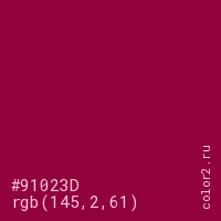 Цвет #91023D в цветовой модели RGB обозначается тремя октетами (145, 2, 61) в десятичном формате и #91023D в шестнадцатиричном (hex) формате, которые являются интенсивностью красного 145 (hex 91), интенсивность зелёного 2 (hex 02) и интенсивность синего 61 (hex 3D).