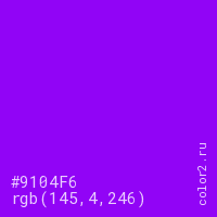Цвет #9104F6 в цветовой модели RGB обозначается тремя октетами (145, 4, 246) в десятичном формате и #9104F6 в шестнадцатиричном (hex) формате, которые являются интенсивностью красного 145 (hex 91), интенсивность зелёного 4 (hex 04) и интенсивность синего 246 (hex F6).