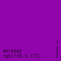 Цвет #9105AC в цветовой модели RGB обозначается тремя октетами (145, 5, 172) в десятичном формате и #9105AC в шестнадцатиричном (hex) формате, которые являются интенсивностью красного 145 (hex 91), интенсивность зелёного 5 (hex 05) и интенсивность синего 172 (hex AC).