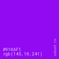 Цвет #910AF1 в цветовой модели RGB обозначается тремя октетами (145, 10, 241) в десятичном формате и #910AF1 в шестнадцатиричном (hex) формате, которые являются интенсивностью красного 145 (hex 91), интенсивность зелёного 10 (hex 0A) и интенсивность синего 241 (hex F1).