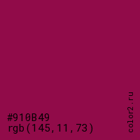 Цвет #910B49 в цветовой модели RGB обозначается тремя октетами (145, 11, 73) в десятичном формате и #910B49 в шестнадцатиричном (hex) формате, которые являются интенсивностью красного 145 (hex 91), интенсивность зелёного 11 (hex 0B) и интенсивность синего 73 (hex 49).