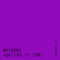 Цвет #910BBC в цветовой модели RGB обозначается тремя октетами (145, 11, 188) в десятичном формате и #910BBC в шестнадцатиричном (hex) формате, которые являются интенсивностью красного 145 (hex 91), интенсивность зелёного 11 (hex 0B) и интенсивность синего 188 (hex BC).