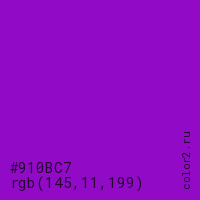 Цвет #910BC7 в цветовой модели RGB обозначается тремя октетами (145, 11, 199) в десятичном формате и #910BC7 в шестнадцатиричном (hex) формате, которые являются интенсивностью красного 145 (hex 91), интенсивность зелёного 11 (hex 0B) и интенсивность синего 199 (hex C7).