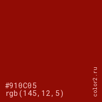 Цвет #910C05 в цветовой модели RGB обозначается тремя октетами (145, 12, 5) в десятичном формате и #910C05 в шестнадцатиричном (hex) формате, которые являются интенсивностью красного 145 (hex 91), интенсивность зелёного 12 (hex 0C) и интенсивность синего 5 (hex 05).