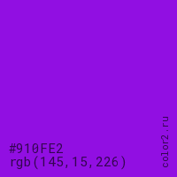 Цвет #910FE2 в цветовой модели RGB обозначается тремя октетами (145, 15, 226) в десятичном формате и #910FE2 в шестнадцатиричном (hex) формате, которые являются интенсивностью красного 145 (hex 91), интенсивность зелёного 15 (hex 0F) и интенсивность синего 226 (hex E2).