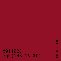 Цвет #911026 в цветовой модели RGB обозначается тремя октетами (145, 16, 38) в десятичном формате и #911026 в шестнадцатиричном (hex) формате, которые являются интенсивностью красного 145 (hex 91), интенсивность зелёного 16 (hex 10) и интенсивность синего 38 (hex 26).