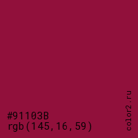 Цвет #91103B в цветовой модели RGB обозначается тремя октетами (145, 16, 59) в десятичном формате и #91103B в шестнадцатиричном (hex) формате, которые являются интенсивностью красного 145 (hex 91), интенсивность зелёного 16 (hex 10) и интенсивность синего 59 (hex 3B).