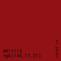 Цвет #911115 в цветовой модели RGB обозначается тремя октетами (145, 17, 21) в десятичном формате и #911115 в шестнадцатиричном (hex) формате, которые являются интенсивностью красного 145 (hex 91), интенсивность зелёного 17 (hex 11) и интенсивность синего 21 (hex 15).