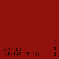 Цвет #91120D в цветовой модели RGB обозначается тремя октетами (145, 18, 13) в десятичном формате и #91120D в шестнадцатиричном (hex) формате, которые являются интенсивностью красного 145 (hex 91), интенсивность зелёного 18 (hex 12) и интенсивность синего 13 (hex 0D).