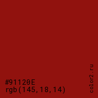 Цвет #91120E в цветовой модели RGB обозначается тремя октетами (145, 18, 14) в десятичном формате и #91120E в шестнадцатиричном (hex) формате, которые являются интенсивностью красного 145 (hex 91), интенсивность зелёного 18 (hex 12) и интенсивность синего 14 (hex 0E).