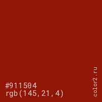 Цвет #911504 в цветовой модели RGB обозначается тремя октетами (145, 21, 4) в десятичном формате и #911504 в шестнадцатиричном (hex) формате, которые являются интенсивностью красного 145 (hex 91), интенсивность зелёного 21 (hex 15) и интенсивность синего 4 (hex 04).