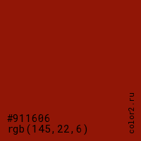 Цвет #911606 в цветовой модели RGB обозначается тремя октетами (145, 22, 6) в десятичном формате и #911606 в шестнадцатиричном (hex) формате, которые являются интенсивностью красного 145 (hex 91), интенсивность зелёного 22 (hex 16) и интенсивность синего 6 (hex 06).
