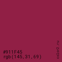 Цвет #911F45 в цветовой модели RGB обозначается тремя октетами (145, 31, 69) в десятичном формате и #911F45 в шестнадцатиричном (hex) формате, которые являются интенсивностью красного 145 (hex 91), интенсивность зелёного 31 (hex 1F) и интенсивность синего 69 (hex 45).